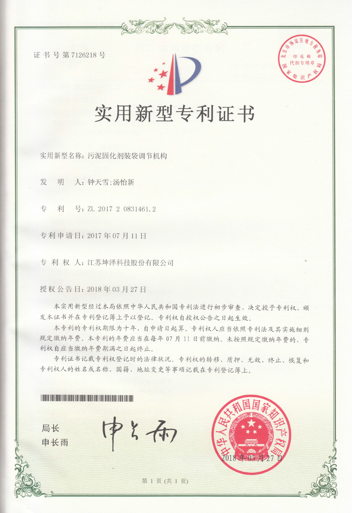 公司设有“南京(坤泽)淤泥资源化及产业化工程技术研究中心”和“连云港(坤泽)淤泥软基固化工程技术研究中心”,拥有多项专利,覆盖了固化剂、固化土产品以及施工工艺及专有生产和施工设备。